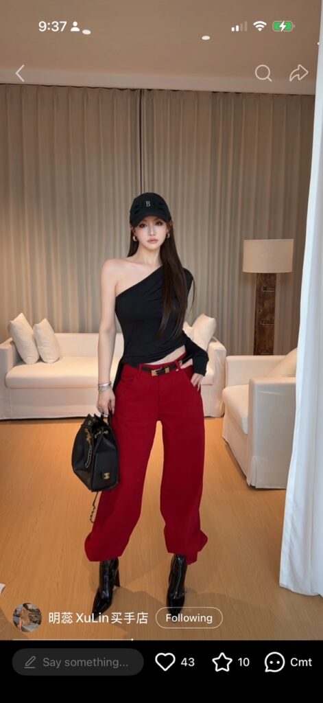 穿了条红色工装裤,宽松的那种,腰束着,裤脚收口堆在脚踝上,口袋很多。