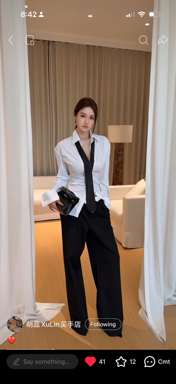 白衬衫。交叉收腰。领口开到胸口中间。黑色领带松松地挂在翻领上。黑色阔腿裤。赤脚。没穿鞋。头发我简单扎了一下,但有几缕散在脸侧。补了口红。正红唇。